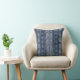 Modern navy blue and white mudcloth style throw pillow with an ethnic tribal geometric print with triangles, diamonds, squares and vertical stripes on a linen texture look background.