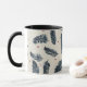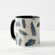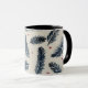 A coffee mug featuring a denim blue and red fern design