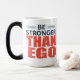 This mug design features a motivational phrase, "BE STRONGER THAN EGO," displayed in bold, capitalised letters. The text layout uses two colours for emphasis: the words "BE STRONGER" are in a dark navy-blue colour, while "THAN EGO" is in bright red. The typography is bold and distressed, giving it a rugged and impactful appearance. Subtle horizontal lines above and below "BE STRONGER" add balance and structure to the design. This style would appeal to those looking for an empowering, minimalist aesthetic.