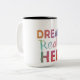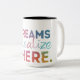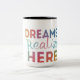A stylish mug with "dreams realise here" in vaberient and in multicolour