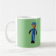 Baseball Uniform in blue, is worn by crocheted doll. Blue Cap has white letters. Opposite side of mug has name that may be personalised. Background of pale green. (another mug is available with image/name reversed)