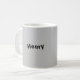 Baseball Uniform in blue, is worn by crocheted doll. Blue Cap has white letters. Opposite side of mug has name that may be personalised. Background of pale grey. (another mug is available with image/name reversed)