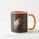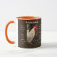 This two tone mug is shown in espresso brown with orange interior and handle with photo of a Rhode Island White chicken rooster on both sides of mug along with