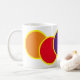 Rings of yellow are filled with various colours (orange, red, purple, blue) and overlap each other.