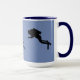 Divers and turtles in silhouette. Black images of two divers and three turtles on a medium blue background.