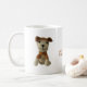 Dog on either side of name. Orange and white dog is image of a crocheted toy doll. Name in centre may be personalised and shows in orange text.