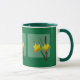Photographic image of yellow daffodils against diffused squares on dark green background.
