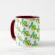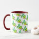 Green leaves with reddish highlights, are multiplied across the mug. Reddish stem supports 3-d looking leaf in shades of green.