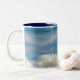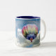 Rainbow coloured hot air balloon is soaring among the white clouds in a blue sky. See similar teapot here: