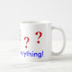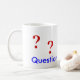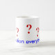 Question marks in red. 5 are spaced around the mug. Below is text in blue "Question everything"