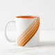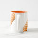 Orange lines in varying five shades of blue. Dark to light, bottom to top. Two Sets of stripes are placed diagonally from top to bottom of cup.