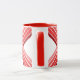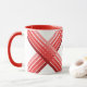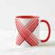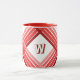Red lines in varying five shades Dark to light, bottom to top. Two Sets of stripes are crossed, forming a square in the middle. Personalise with your Initial in centre of square.