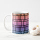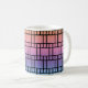 Leaded glass pattern in black, is rows of small squares divided by rows of small squares. Background is a horizontal rainbow in blues, purple, pink and orange.