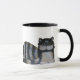 Cat, striped black and white. Painting of the cat is posed laying with tail curled and heat alert. Long hair shows in fluffy tail and face. One image on each side, facing the handle of the mug.