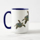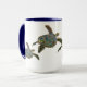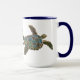 Turtles in three sizes swim around mug. Shells are mottled blues and greens, with tan outlines. From original silk painting by Susan Lilly.