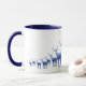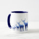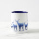 This mug is shown in white exterior with pretty blue deer/elk heard printed on the lower edge of the mug from right to left graduating in size as if they are walking off in the distance. Interior and handle is navy blue.