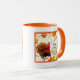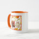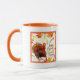 This two-tone mug has a nice fall leaves and turkey print with holiday greeting of "Happy Thanksgiving". Inside shown in orange with orange handle.