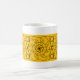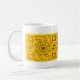 Graphic image of a waterwheel bordered by circles, squares and triangles. Image is repeated three time around mug and is placed on top of an orange rectangle strip.