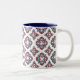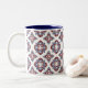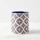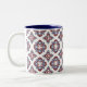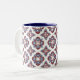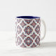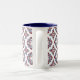 This pretty coffee or tea mug has a country farmhouse feel. The inside is navy blue. The design is a Navy and raspberry tile print on a white background. This is an original tile design. The design comes from an original tile by Oregon tile maker, Fay Jones Day