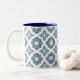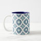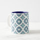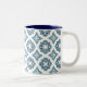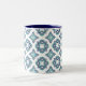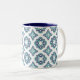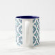 This pretty coffee or tea mug has a country farmhouse feel. The inside is navy blue. The design is Navy and turquoise tile print on a white background. The design comes from an original tile by Oregon tile maker, Fay Jones Day