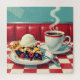 Cute puzzle with an illustration of mixed berries pie with melting vanilla ice cream on top with a warm cup of coffee at the diner.