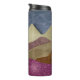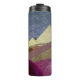 An abstract landscape with unique colours and textures showing a mountain scene in shades of purple, tan, beige, and brown.