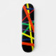 This skateboard deck is covered in multi-coloured lines - red, orange, yellow, green, blue, purple - on a black background that makes them pop.