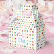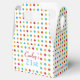 Multi-coloured polka dot pattern on personalised favour boxes. Personalise for Birthdays or any occasions.