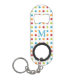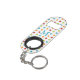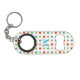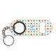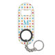 Multi-coloured polka dots on personalised mini bottle opener keychain.