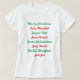 Here's a shirt to put you in the Christmas spirit in many countries. It features the greeting "Merry Christmas" in Spanish, French, Italian, German, Portuguese, Dutch, Norwegian/Swedish--as well as English. The text is in a festive, script font that alternates between green and red.