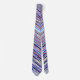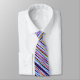 This tie features a fractal pattern of intersecting diagonal stripes. Colours include navy blue, red, white, yellow, aqua and light blue. Design is printed on both sides.