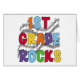 Big bright text in primary colours reads "1st Grade Rocks" against a background of black sheet music on 1st Grade Rocks teacher and student T-shirts, hoodies, mugs, school tote bags, cards, stickers, magnets, and more!