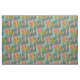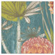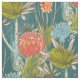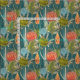 An abstract African botanical pattern in shades of orange, burgundy, blue and green on a teal blue background.