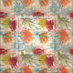 An abstract African botanical pattern in shades of orange, burgundy, blue and green.