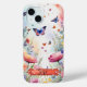 Celebrate enchantment with this stunning phone case featuring a butterfly with a blue centre, surrounded by pink and outlined in deep blue. This design is set against a backdrop of delicate pink flowers and a hint of peachy sky, creating a vibrant and dreamy scene. The case includes a customisable red-orange name frame, adorned with lavender and black jewels, and sparkling stars, allowing you to add a personal touch. This phone case blends whimsical elegance with vivid colours and personal flair, perfect for adding a magical touch to your device.