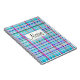 Colourful notebook with multicolor check stripes pattern in blue, pink, purple and green. The label text is customisable. Designed with a smile by iolantesdesigns :-)!