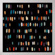 A pattern of irregular rectangles in a colour scheme of orange, red, ivory, turquoise, grey, eggplant and black.