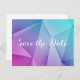 Sharp and modern Jewel Tones Wedding Save the Date Postcard featuring a multicolor (blue, purple, pink, and turquoise) funky geometric triangle background. This chic and simple design is a unique choice for announcing a modern wedding. Easy to customise with your wedding details. Click "Customise It" to find more personalisation options.