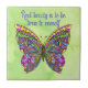 Protect your table or countertop when you use this joyful Multicolor Pattern Butterfly Ceramic Tile. Multicolor Pattern Butterfly is a bold, vibrant butterfly created by Debi Payne Designs for those that want to maintain a positive mindset. This exciting colourful butterfly is jam-packed with layers of shapes and repeating patterns all in bold, vibrant colours. The butterfly is accented by the positive hand-lettered text in blue that reads “Real beauty is to be true to oneself.” The butterfly and text are over a vibrant green watercolor wash background.
