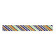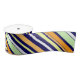 An eye-catching ribbon with a multicolor pattern of diagonal stripes, in lime, yellow, orange and navy blue. The eye-catching ribbon adds a decorative finishing touch to wrapped gifts, crafts and ornaments.