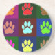 A colourful dog paw print pattern in pink, orange, blue, yellow and other colours.