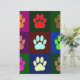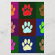 A colourful dog paw print pattern in pink, orange, blue, yellow and other colours.
