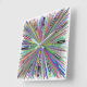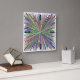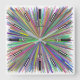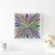 This square clock design features a pattern with lines coloured various colours appearing to burst out from a central point. It also features rectangles marking the hours, and numbers indicating the hours "12", "3", "6", and "9".