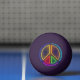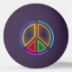 Graphic of a multicolored neon peace sign symbol against a brick wall background