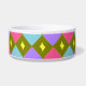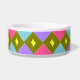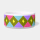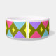 This awesome pet bowl has an abstract pattern with rows of pink blue and purple diamonds on it. Each row is separated by a row of dark green diamonds. Each of the dark green diamonds has a hole in the middle of it. Heres the fun bit, you can fill in that hole with a choice of over 200 colours to make a unique design. Here the holes have been filled with a beautiful yellow colour as an example. To select your colour and see the effect it has on the design simply click on the “customise it” button, go to the colours section and click on background then pick whichever colour you would like to put into the design. You can try as many colours as you like until you find the one that works for you.