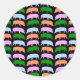 This round sticker features a series of different coloured cartoon style pigs. The hogs are in alternating lines of pink and blue and green and orange. The background is black.