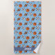 A beach towel with a sports themed pattern from a selection of sports ball equipment like basketball, American football, soccer ball, baseball, tennis ball and a golf ball. Background colour can be changed. Great for boys who love sports! Add name in blue banner space provided.