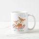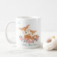 Sweet drawing of a mother and baby deer on a tree stump with flowers and green butterflies.