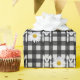 Mum text with white daisy flower and petals on white and black gingham pattern.