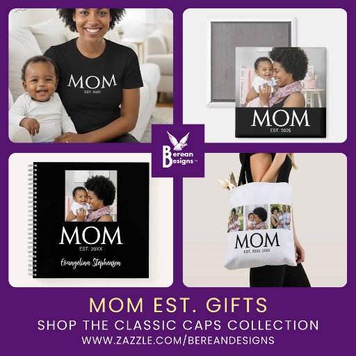 Black White Mum Established Classic Caps 3 Photo Design. Replace the photos with your own of your kids and change the years to the years you became a mum. Classic black serif font can be personalised by changing MOM to MUM, MAMA or even MIMI. This Mum tote would make a great gift for Mother's Day—especially for a new mum—or birthday, or "just because". This is a timeless, stylish design that speaks volumes. Please message me for extra branding for souvenir gifts for your mum group or church fellowship. Also in black.